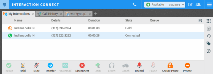 La barre d'outils Contrôle de file d'attente permet d'effectuer des opérations de contrôle d'appel standards, telles que la prise, le transfert ou la déconnexion d'appels.