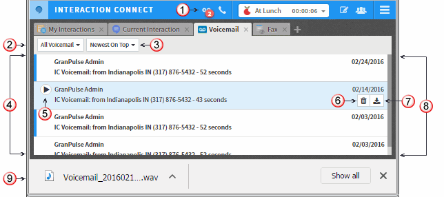 Remarque : avant de pouvoir utiliser la vue Messagerie vocale, vous devez la rendre disponible en tant que vue dans le client CIC. Pour plus d'informations, consultez la rubrique Vue Messagerie vocale.