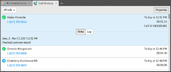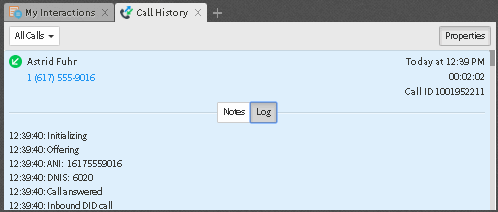 Dans l'Historique des appels, sélectionnez une interaction et cliquez sur le bouton Propriétés. Pour sélectionner les propriétés des interactions à afficher, cliquez sur Notes ou Journal.