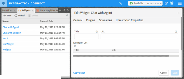 Les extensions sont des modules d'extension créés par vos développeurs et ajoutés à un widget Genesys. Pour plus d'informations sur la création d'une extension pour un widget Genesys, consultez la rubrique Extensions de widgets Genesys, https://docs.pccextendedsupport.com/Documentation/PSAAS/Public/Administrator/GWCBusExtensions dans la bibliothèque de documentation Pure Engage.