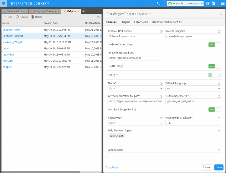 La page Général du volet Configuration de widgets s'applique à l'ensemble du widget et gère les thèmes, les langues et les périphériques mobiles. Elle permet également de configurer des facteurs propres à CIC, tels que le nom du serveur IC et le proxy inverse, et détermine s'il y a lieu d'utiliser HTTP ou HTTPS pour la communication entre le serveur Web et le serveur IC.