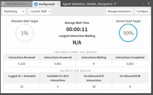 Vous pouvez voir les données statistiques dynamiques d'une file d'attente d'un groupe de travail sélectionné de manière efficace et très visuelle. Les statistiques Niveau de service, Taux d'abandon et Temps d'attente sont affichées en évidence. Vous pouvez comparer les statistiques de files d'attente de groupes de travail spécifiques en affichant cette vue plusieurs fois et en sélectionnant toujours un groupe de travail différent. Avec la licence appropriée, vous pouvez sélectionner les statistiques que vous souhaitez afficher et également activer des alertes relatives à ces statistiques.