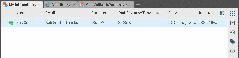 Le chat sélectionné détermine la session de chat qui apparaît dans la vue Interaction actuelle. L'interaction de chat actuellement sélectionnée est mise en surbrillance.