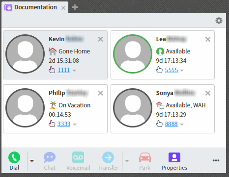 Les vues de numérotation rapide permettent d'appeler rapidement les contacts appelés souvent. Les entrées dans une vue de numérotation rapide affichent le nom, le statut d'utilisateur et le numéro par défaut de chaque contact. Le numéro par défaut est un hyperlien sur lequel vous pouvez cliquer pour appeler le contact. Vous pouvez également cliquer sur la flèche vers le bas en regard du numéro de téléphone par défaut du contact. La liste contient tous les numéros de téléphone disponibles pour le contact sélectionné. Cliquez sur l'un de ces numéros pour le composer.