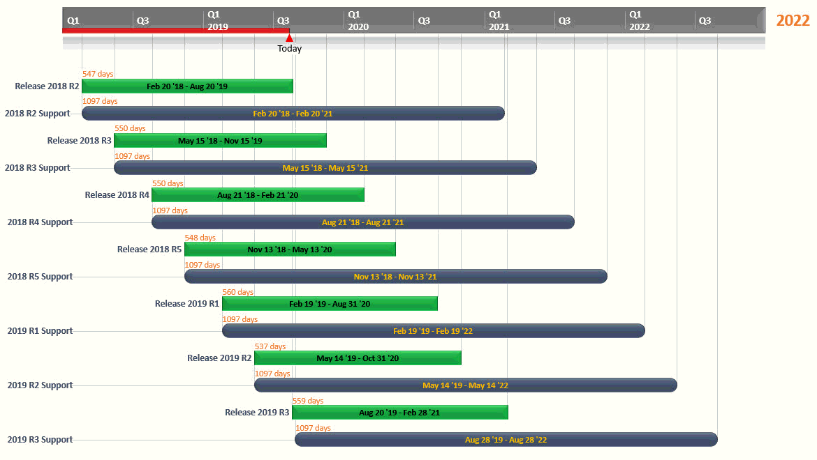 The following chart illustrates the software maintenance (updates) period (green) and the standard support period (dark blue) for current PureConnect (CIC) releases.