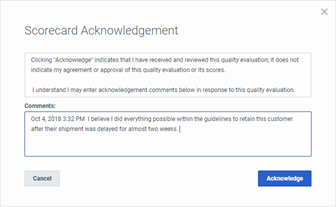 In the Scorecard Acknowledgement dialog box, you can optionally enter any comments relevant to this scorecard.