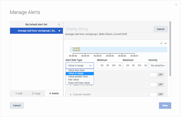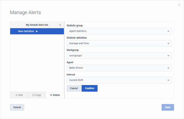 Note: The appearance of the Manage Alerts dialog box varies, depending on the selected statistic. For example, the Average Wait Time statistic has three parameters: Workgroup, Agent, and Interval (such as Current Shift). Other statistics require different parameters.