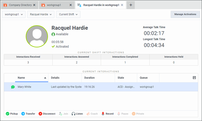 The Agent Statistics view summarizes the activity of a single agent in a selected workgroup. This view enables supervisors to manage agents. It shows user status, workgroup activation status, and the selected agent's specific statistics. It includes a queue view of the interactions assigned to the agent with supervisor-focused queue controls including Coach, Listen, and Join.