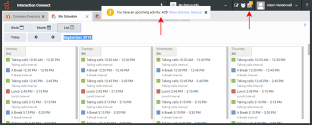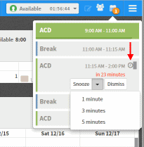 Schedule reminders appear as both desktop alerts and as badges on the Activity Feed icon. If the My Schedule view is not visible when an alert occurs, the desktop alert remains visible until you close it. This ensures that you are alerted when you are out of adherence if you are away from your desk when the alert occurs.
