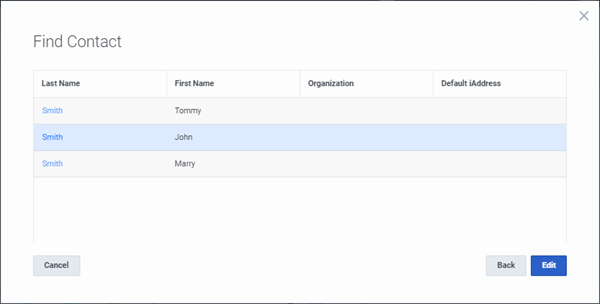 In the Find Contact search results page, click a Contact Name. Or click anywhere in the row and click Edit.