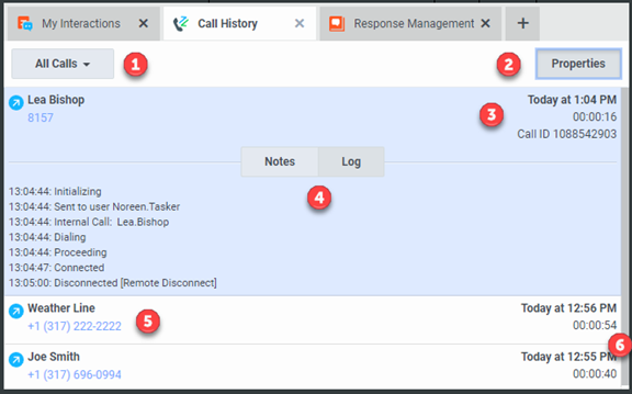 History is tracked for calls that appeared in My Interactions. These are calls that were inbound to you, calls placed by you, calls transferred to you, and calls used to retrieve voice mail messages.