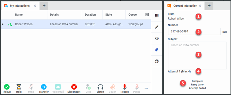 When you pick up a Callback request, the Current Interaction view displays the Caller name and number.
