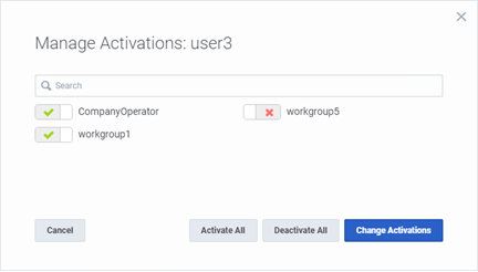 Click the activation status toggle switches to activate or deactivate the selected user in a selected workgroup.