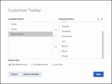 To change the order of buttons on the toolbar, from the Selected Buttons list, select the button name and use the Up and Down arrows to move the button to the desired position on the toolbar.