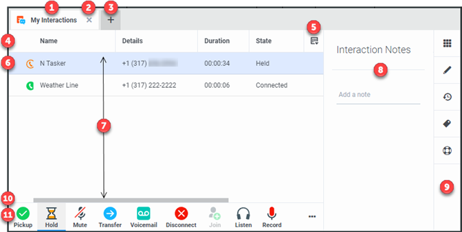 The current interactions (calls) in your user queue appear in My Interactions. These are the interactions you currently manage. If you are a member of one or more ACD workgroups, interactions assigned to you from those workgroups appear in My Interactions. The name of the ACD workgroup from which those interactions came in the Queue column.