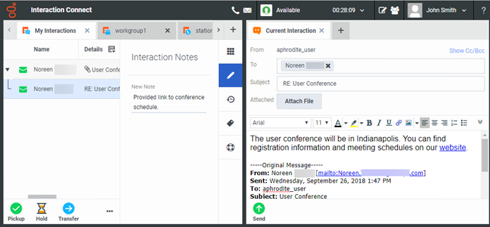 An email reply interaction is associated with the original incoming email interaction in an Email Conversation. These associated interactions appear below the original interaction and are linked to it.