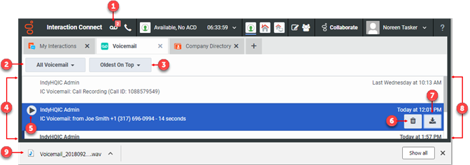The Voicemail View contains the Voicemails List. It contains the voice mail messages you have not yet deleted, including both previously played and unheard voice mail messages. Tip: A blue bar indicates an unheard message. Note: If your CIC administrator configures your user account to receive an email alert whenever you receive a voice mail message, then two entries appear for each voice mail message: a voice mail notification and the voice mail. You can select either the notification or the voice mail and click Play to listen to the voice mail. |