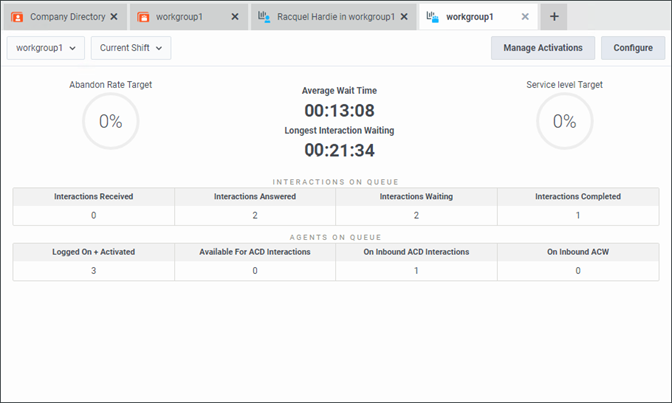 To select and arrange the displayed statistics, click Configure. See Display and Configure the Workgroup Statistics view. Requirement: To configure which statistics appear in this view, you need the Interaction Supervisor Plugin: Workgroups license. |