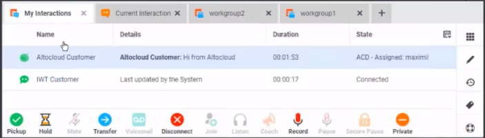 Chats initiated by Altocloud appear in the Interaction Connect My Interactions view, just like PureConnect web chats. Altocloud chats enable agents to display journey map information in the Altocloud view. For more information, see Altocloud view.
