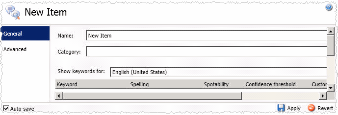. A New Item is created in the lower pane. This new item is a keyword set, which enables you to enter multiple keywords and phrases.