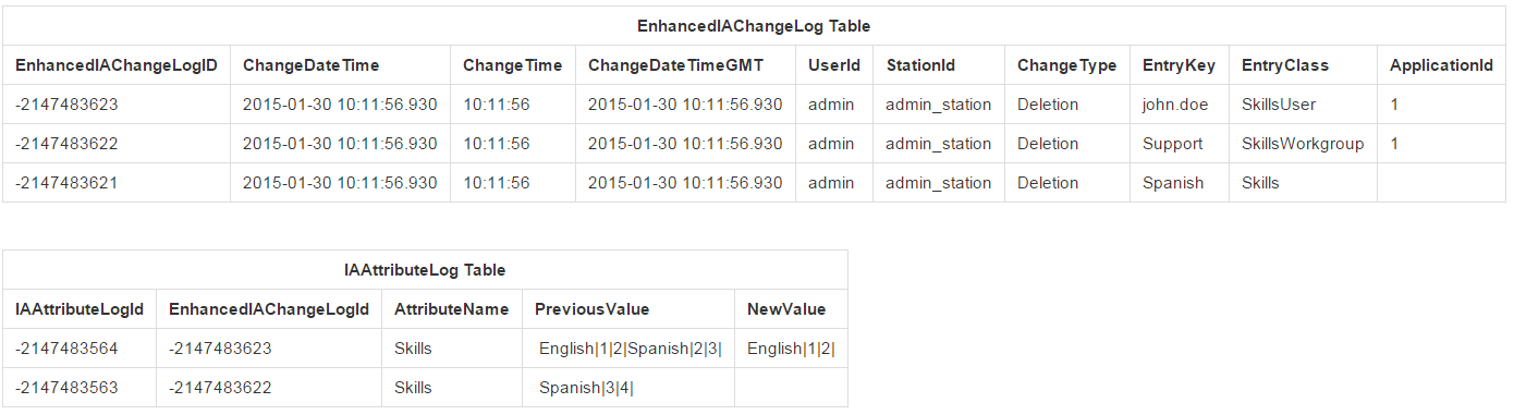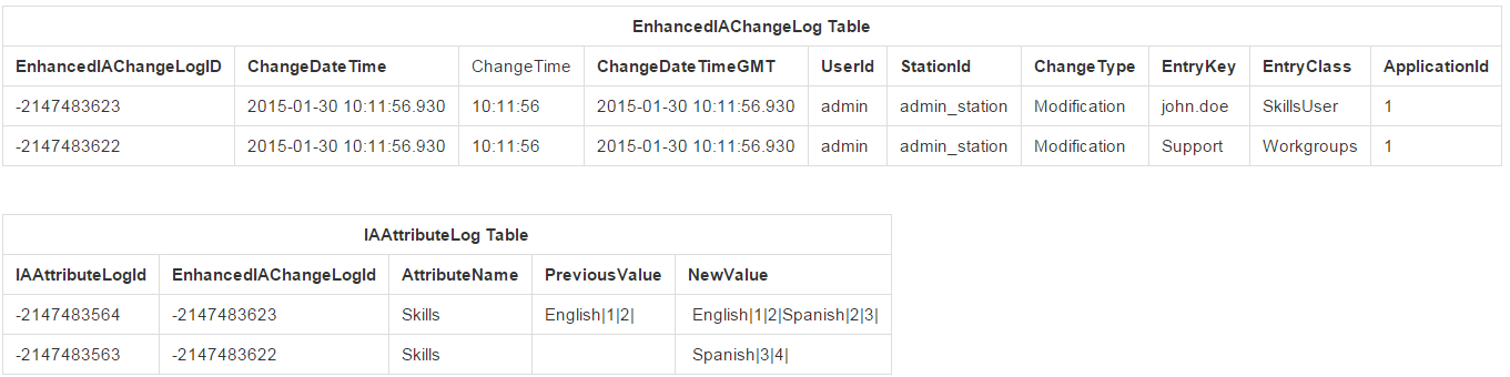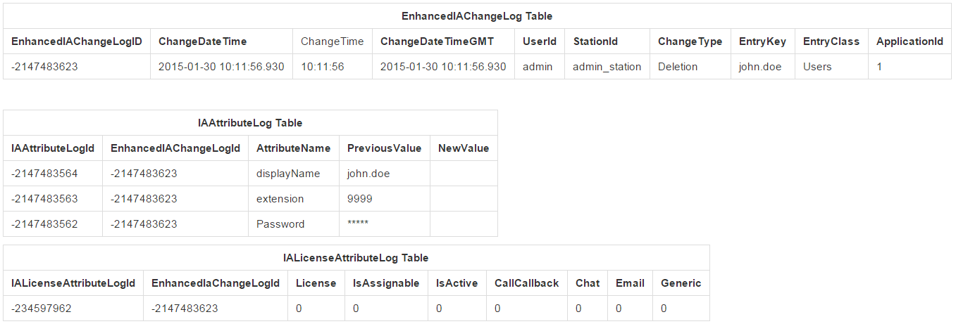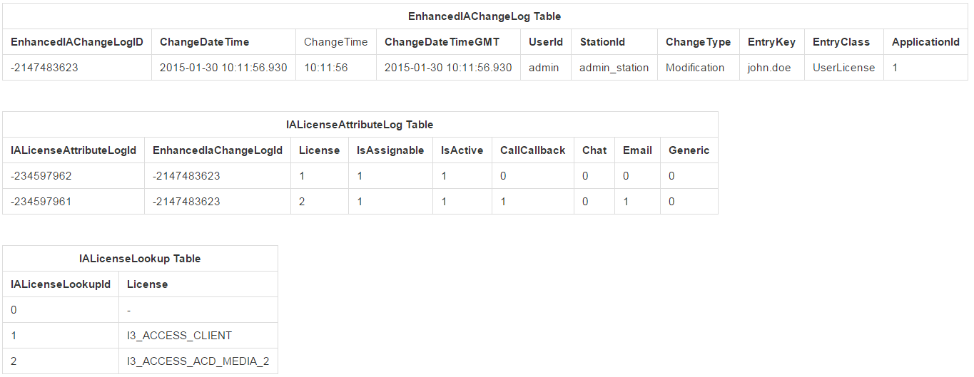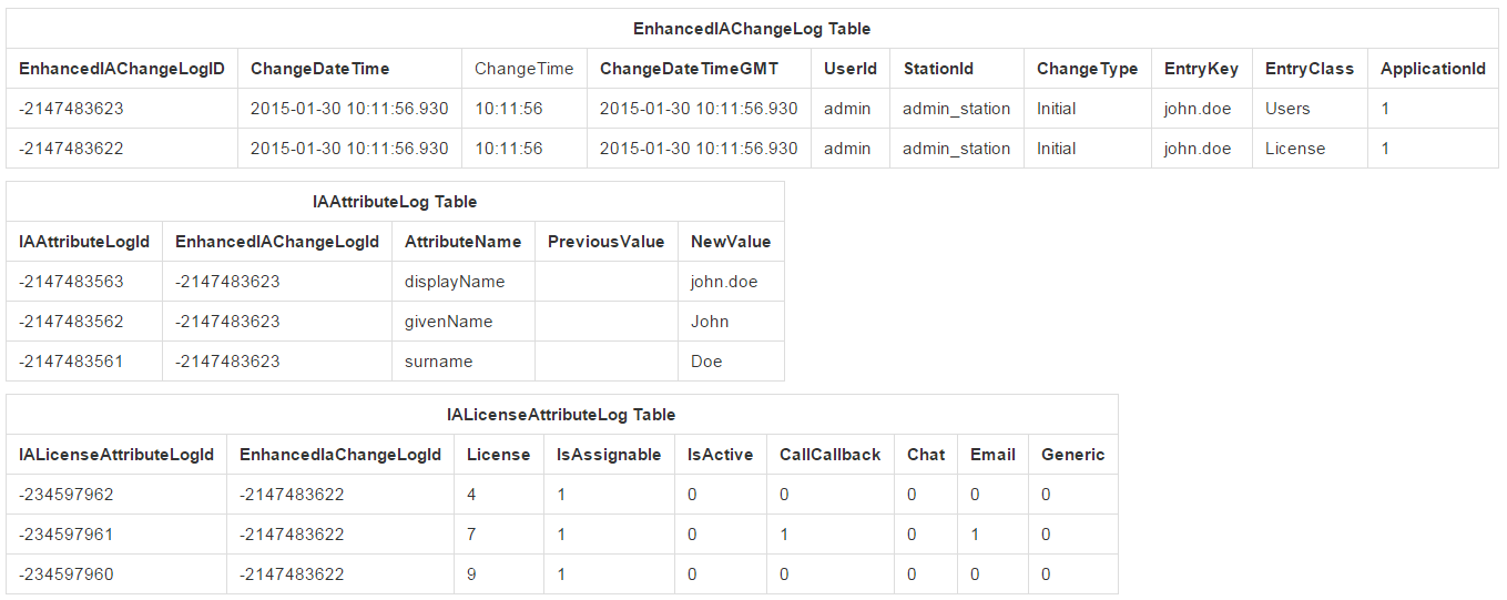 This example shows a snapshot of data that was taken when the Enhanced Interaction Administrator Change Log was enabled. Notice that value in the ChangeType column is “Initial. You can also see that both the IAAttributeLog table and the IALicenseAttributeLog table have multiple records tied to a single record in the EnhancedIAChangeLog table.