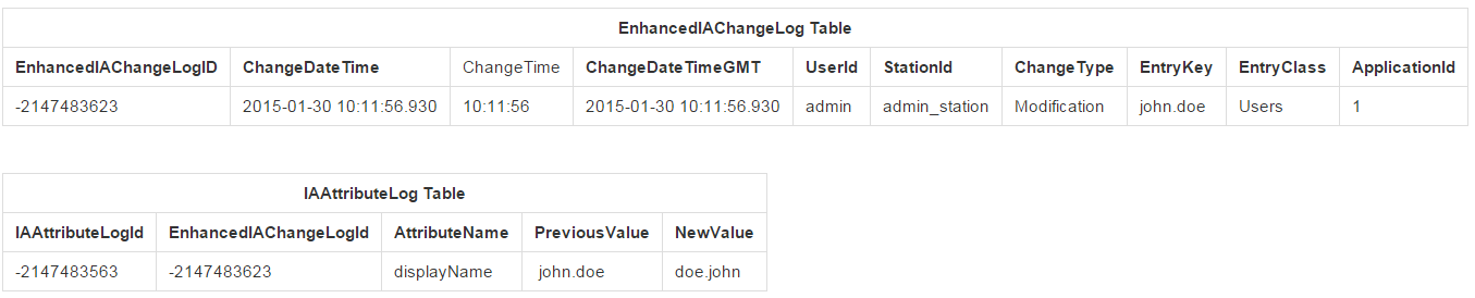 This example shows the change log record with the Change Type of Deletion. This indicates that the user record was deleted. The IAAttributeLog table is also updated to show what attributes were set on that user when the user was removed.