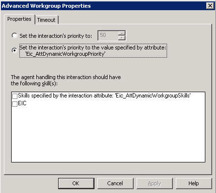 The Properties tab allows you to assign a priority to the interaction (0= lowest, 1000 = highest) by either setting a static value or by using the value contained in the ‘Eic_AttDynamicWorkgroupPriority’ interaction attribute.
