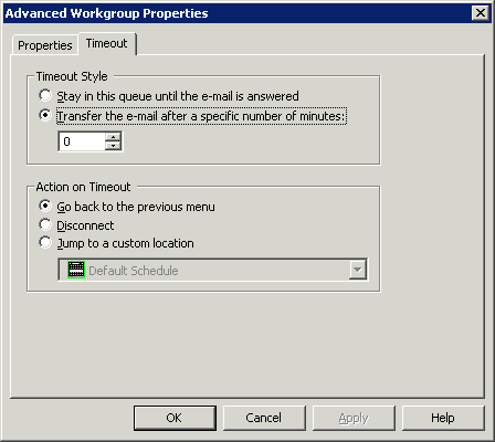 This dialog appears when the Advanced Workgroup Settings button is pressed on the Transfer to a Workgroup node for an email interaction. This dialog allows the designer to set priority within the queue, needed agent skills, the length of time that the interaction should remain in the queue before timing out, and processing to perform after a time out.