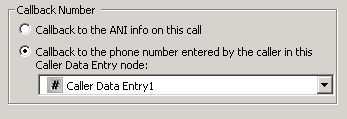 If the Request Callback is part of an in-queue menu that includes a Caller Data Entry node, the caller can enter a specific telephone number during a callback request and Interaction Attendant will pull that number from the Caller Data Entry node when processing the callback request. In the Callback Number frame, select the Callback to the phone number entered by the caller in this Caller Data Entry node radio button and from the dropdown list select the Caller Data Entry node listed in the in-queue menu.