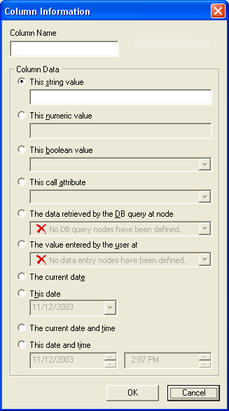 This option assigns the value entered by the caller to the column. The list box is empty unless the server configuration contains at least one Caller Data Entry node.