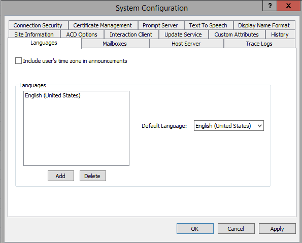 Languages are defined in Interaction Administrator. Interaction Attendant lists the names of supported languages in audio-related forms and dialogs, so that you can select a particular language for playback or recording of a voice prompt. This topic explains how to configure a CIC Server to support additional languages.