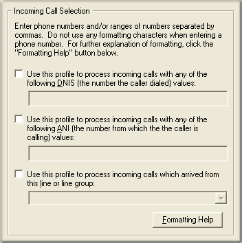 This section of the page defines call characteristics that will be compared to the characteristics of an incoming call to determine whether it should be processed by this profile. A Custom Inbound Call Profile can filter calls based upon DNIS, ANI, line, or line group information that is associated with each call.
