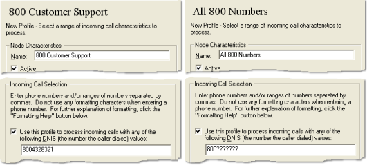 To determine which profile best matches incoming call criteria, Interaction Attendant analyzes custom profiles to find the best match. Suppose, for example, that you create a profile for All 800 numbers, and another for calls to one Customer Support number. The example below illustrates how the profiles might look:
