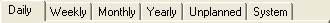 The tabbed pages at the bottom of the Schedule node set scheduling criteria. These settings establish daily, weekly, monthly, yearly, unplanned, or system criteria that determine when menu operations attached to the schedule will execute. See Schedule Types.