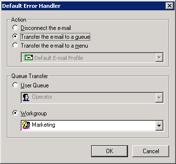 You can set up this error handler to terminate the interaction, or transfer the Email message to a menu, user queue, or workgroup queue.