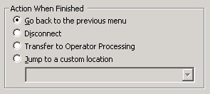 These options set the processing that occurs after the operation completes successfully, when flow of control leaves this node. You can return control to the previous menu, disconnect the call, transfer to an operator profile, or jump to any node or action that has been defined for the current server.