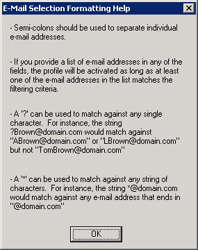 This dialog appears when the Formatting Help button is pressed on a Custom Email Profile form. It displays tips for entering email addresses and for using wildcards to filter a profile based upon "To", "Cc" and "From" fields in an email message. When you are finished, press OK to dismiss the dialog.
