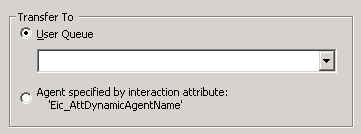 The options in this frame determine whether email is transferred to a user queue or to an agent defined in the 'Eic_AttDynamicAgentName' interaction attribute. In general, you should specify a user queue when you need to route email to a specific person, and you should select the 'Eic_AttDynamicAgentName' interaction attribute when the user has been defined within the interaction attribute.