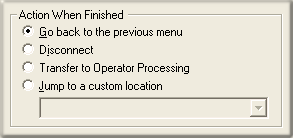 These options set the processing that occurs after the operation completes successfully, when flow of control leaves this node. You can return control to the previous menu, disconnect the call, transfer to an operator profile, or jump to any node or action that has been defined for the current server.