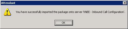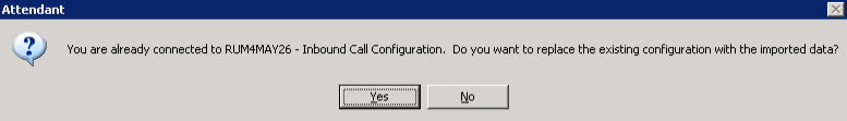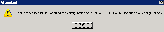 Select Yes to import the Full Configuration, or select No to cancel the import command. Attendant displays a dialog to confirm the configuration was inserted: