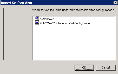 Select a destination server from this list, or select <Other> to connect to an unlisted server. When Other is selected, the configuration is loaded into another server, leaving the configuration of currently connected servers intact. If you choose an existing connection, you are asked to confirm the import operation: