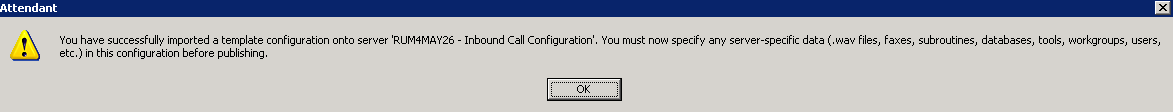 Select Yes to import the configuration template, or select No to cancel the import command. Attendant displays a dialog to confirm the template was inserted: