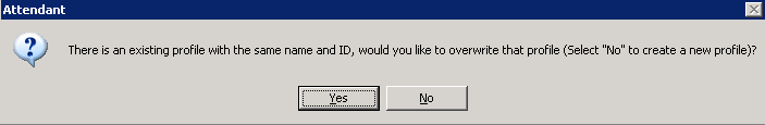 When a standard File Open dialog appears, select an Attendant package (*.atp) to import. Then press Open. A message appears, asking if you want to overwrite the existing profile.