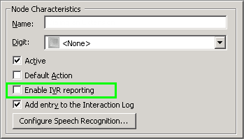 Many Attendant nodes provide a check box that enables IVR Reporting. This option determines whether or not reporting data is collected when control passes through the node. This information is summarized in several IVR Reports. Data can be collected when Attendant profiles, schedules, menus, and complex action nodes are traversed. This feature makes it easy to establish IVR Reporting as an interaction flow is being built, without having to customize handlers and tool steps.