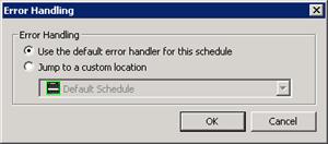 Error handling is also configurable. You can respond to errors by setting up a custom jump, or use the default error handling at the schedule level. The default error handler for the schedule is used by default, but you can change the error handler to jump to a custom location by clicking the Error Handling button.