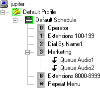 Select Default Schedule in the Transfer the call to this menu list. When you are done, the tree structure should resemble the graphic below. The digits that you assign may differ, depending upon the configuration of your server.