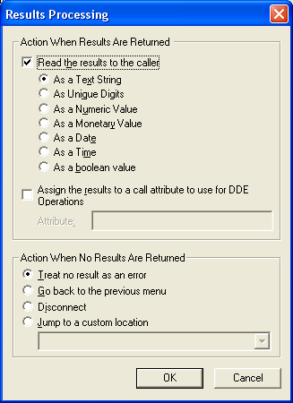 This frame controls the processing that occurs when a DB Query returns data—anything other than a null result. It determines whether data is read back to the caller, and assigns the appropriate text-to-speech pronunciation method for that data type. You can optionally assign the query result to a call attribute.