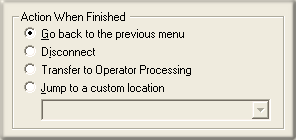 These options set the processing that occurs after the operation completes successfully, when flow of control leaves the node. You can return control to the previous menu, disconnect the call, transfer to an operator profile, or jump to any node or action that has been defined for the current server.