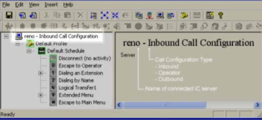 Server nodes are particularly helpful when Interaction Attendant is connected to several servers at one time. A Server node contains all profiles, schedules and operations that are defined for a connected server, for a given call flow (inbound, outbound, or operator).