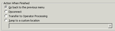 These options set the processing that occurs after the operation completes successfully, when flow of control leaves the node. You can return control to the previous menu, disconnect the call, transfer to an operator profile, or jump to any node or action that has been defined for the current server.